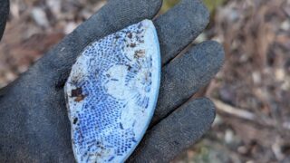 ついに見つけた設楽金山跡を探索します。簡易索道のような遺構に選鉱所の跡、鉱山稼働時の食器の欠片など興味深い遺物がたくさん見つかりました。