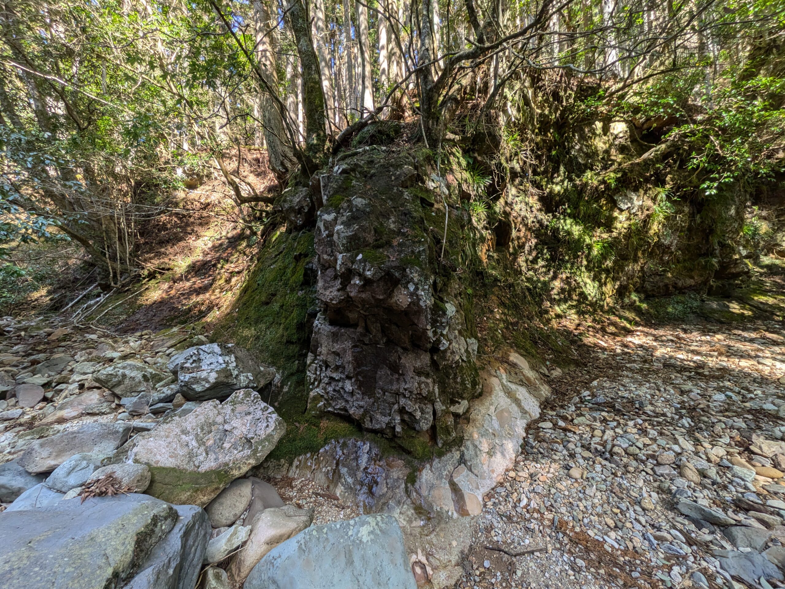 谷筋に降りて早々に、どーんと大きな岩脈がお出迎えをしてくれたのである。岩脈!岩脈と言っているがこんな感じ(リンク先)で周りの岩石に対して別の岩石が貫入している。そして貫入した岩石が周りの岩石より硬いと侵食に耐えて飛び出している。今回見つけた岩脈はかなり硬く、川にせり出すように残されていた。そして谷筋にいくつも岩脈があることから、ここら一帯は岩脈のメッカであると再認識をして少しテンションが上がる。